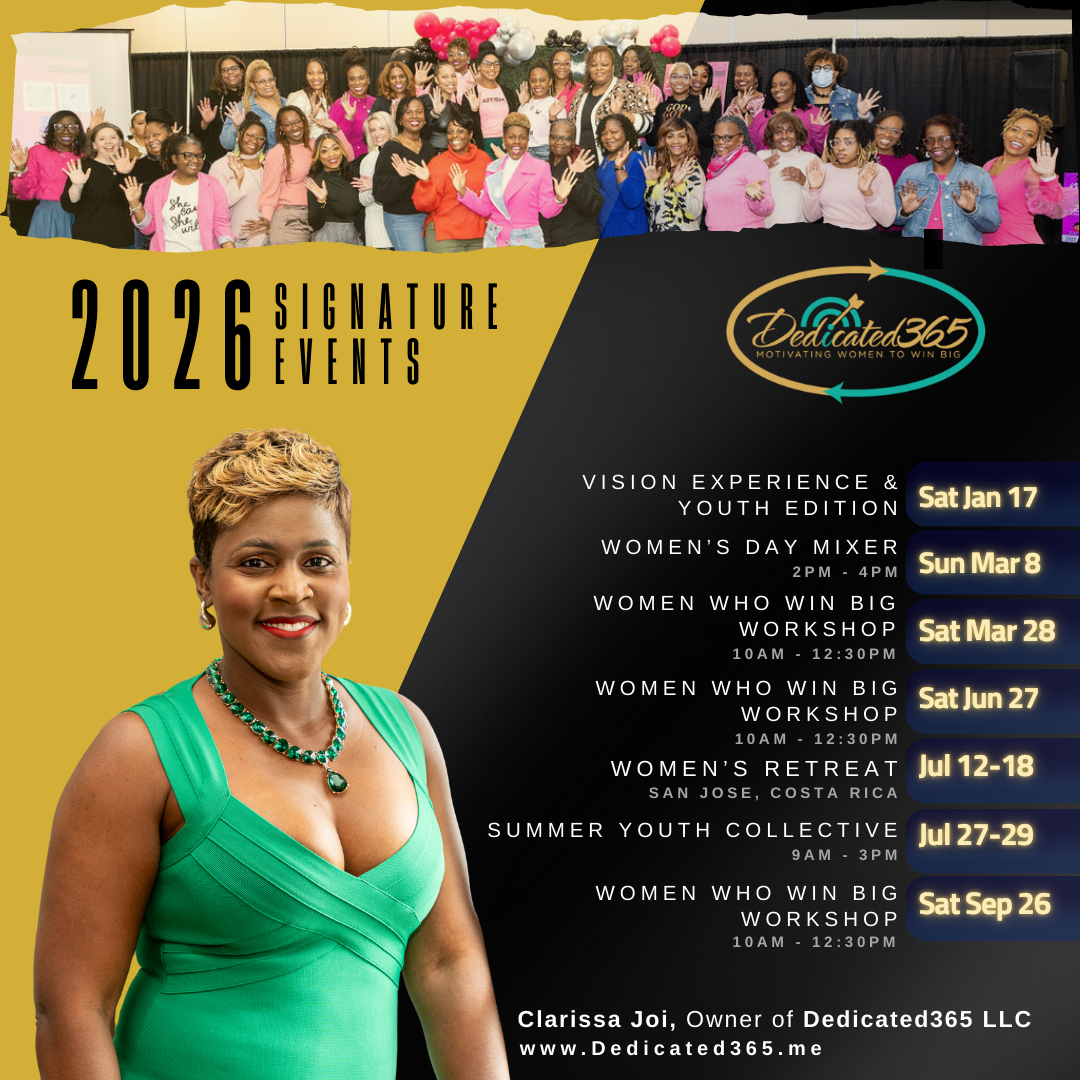 Clarissa Joi’s power-word for 2026 is “Flow”. If you haven’t gotten into a rhythm and you’re tired of never-ceasing stops and starts of your dreams, this is YOUR YEAR. Join our community and attend our signature events to tap into a continuous stream of belief, action, and results. Don’t go at this alone another year! We were built to support and collaborate, so let’s do so.